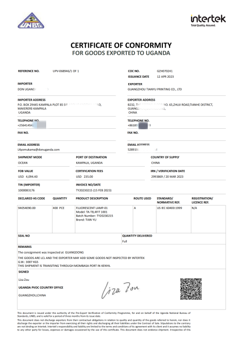 烏干達(dá)PVoC/CoC認(rèn)證辦理注意事項(xiàng) 1.標(biāo)簽:型號(必須與裝箱單/形式發(fā)票一致) 2.標(biāo)簽:需標(biāo)有原產(chǎn)國“Made in China” 3.標(biāo)簽和說明書(如有)需要少使用英文 4.如產(chǎn)品標(biāo)有有效期/保質(zhì)期,貨物需在過期前到達(dá)烏干達(dá)(食品到港后需剩75%的保質(zhì)期) 5.烏干達(dá)電壓:220-240Vac,50Hz, 6.插頭規(guī)格:BS1363或者BS546 7.語言:英語 烏干達(dá)PVOC證書模板